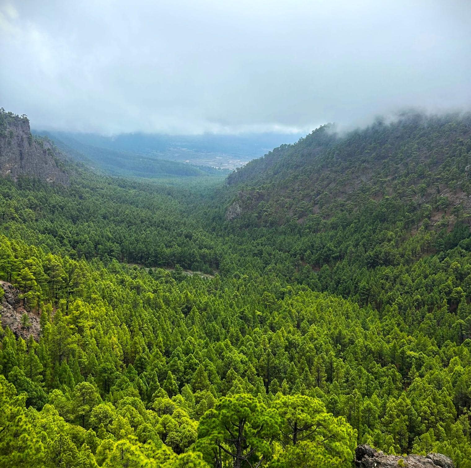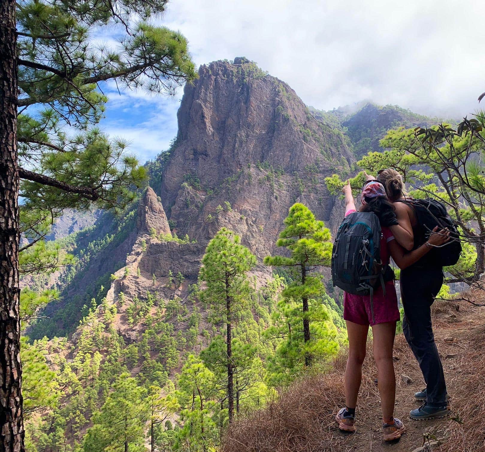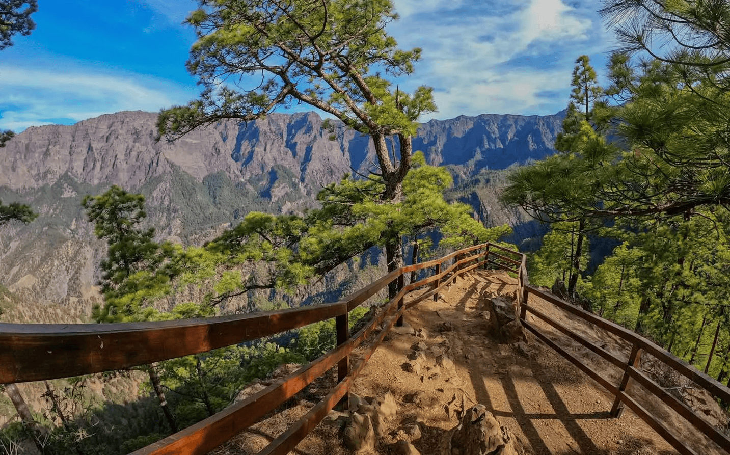 Tour 5: La Cumbrecita ist einer der beliebtesten Aussichtspunkte La Palmas und Startpunkt unserer Wanderung: Inmitten des gigantischen Kessels des Nationalparks gelegen, hat man hier die schönsten Ausblicke auf die stellenweise 2000 Meter in den Himmel ragenden, fast senkrechten Felswände. Der duftende kanarische Kiefernwald spendet uns Schatten.